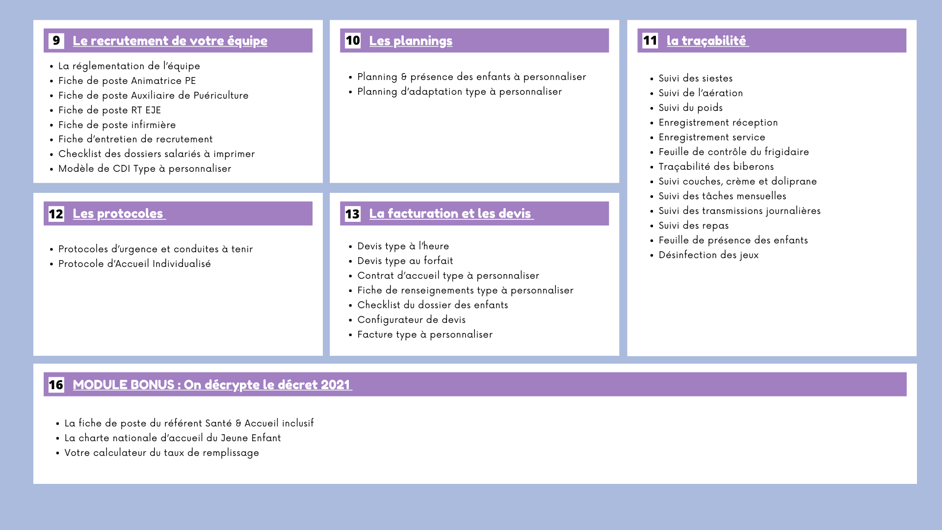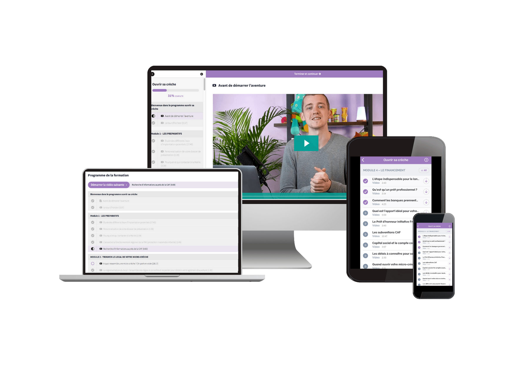 Une réelle feuille de route à suivre étape par étape avec plus de 150 cours au format vidéo et 90 fichiers et documents prêts à être personnalisés, spécialement conçus pour vous apprendre concrètement comment monter votre micro-crèche.
